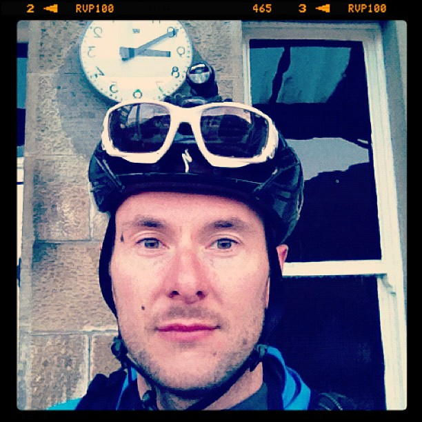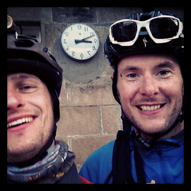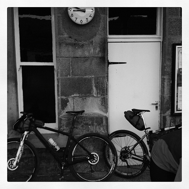 Finally. Finally, the climbing was done. I could sense Blair Atholl in the valley. I could taste my celebratory beer. The descent was fast. Track, then narrow tarmac. We whooped and laughed. My eyes filled briefly. A quick glance at my watch confirmed that not only would we beat 36hrs, we’d sneak in under 35hrs too. Turning on to the main street in Blair, we sprinted out of the saddle. In the wrong direction. A sign for the train station pointed out our error after 20 metres. Oops. I grabbed my photographs and waited for Rob to do the same. He’d been a fantastic companion during the ride. His company and sense of humour had us both laughing at points were I’m sure if I was by myself I’d have been having a quiet word with myself , expending mental energy in the quest to stay motivated. There were times we rode separately for long sections. A trail length apart, a glance over the shoulder or up ahead confirming that the other was still “there”. It felt right that we ended the ride together. My first photo was of both our bikes in front of the clock. Evidence we completed at the same time.