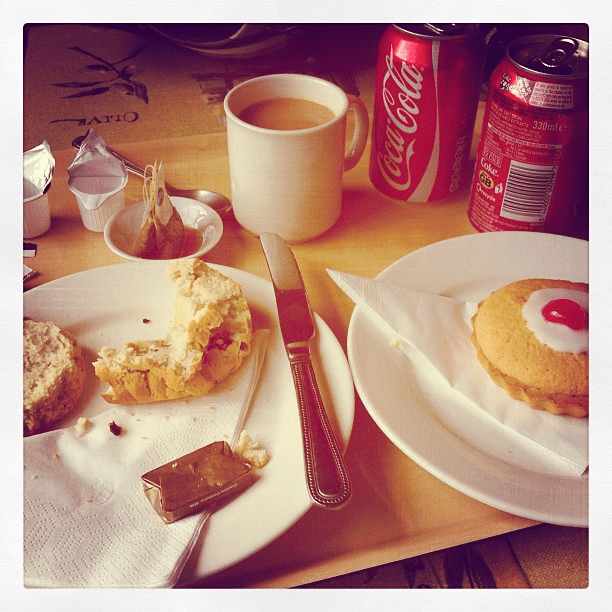 The tarmac to Tomintoul filled me with mixed emotions. It was 9.30am. Would there be anything open when we arrived? I had already decided that I would wait until 10am if necessary. While I had food in my bag, it wasn’t the right food. A wave of unbridled joy washed over me as I rode ahead up Tomintoul high street (maybe a slightly grand term, but any signs of civilisation felt grand). The Old Firestation Cafe had a familiar looking bike propped up outside. It was open. Without looking at the menu, and barely greeting Jack, I walked straight to the counter and (with a twinkly in my eye) requested the biggest breakfast they did. Incredibly, I had managed to find a greasy spoon in Scotland that didn’t serve a fry-up. No matter. Two bacon and egg butties, a scone, a bakewell tart, cup of sweet tea and two cans of coke saw me right. It did for Rob too. Profits must have trebled for the owners that day.